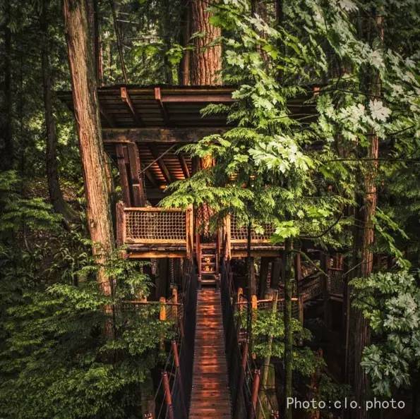 吊桥公园内很多原始树木的年龄比温哥华、甚至加拿大还要“老”,直径超过一米的树随处都是,最令人兴奋的玩法是“树梢探险”(Treetops Adventure),凌空穿梭在参天树梢上的七座高空小吊桥间,零距离观赏繁茂植被、苍翠丛林,惊诧地感受自己与广袤森林的心灵碰撞。