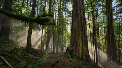 大熊雨林逾半是原始森林(360多万公顷),遍布着有近千年树龄的红雪松、北美香柏、铁杉和云杉。千姿百态的河谷和河口,逶迤穿过林木茂密的高耸山脉,孕育着丰富的海洋生物。