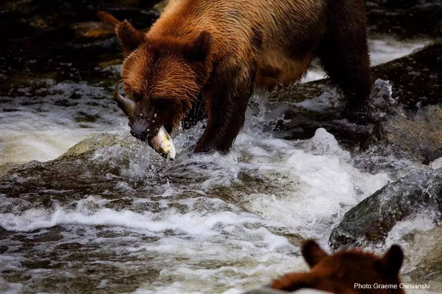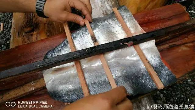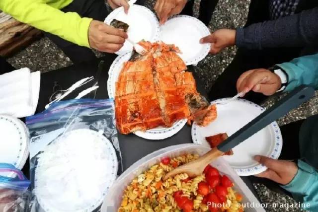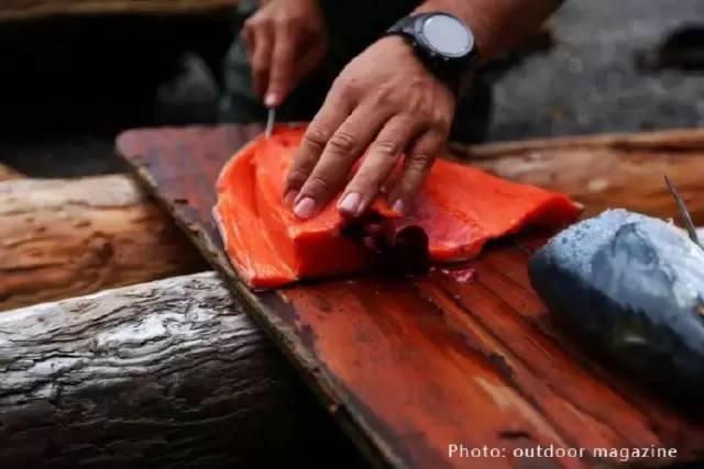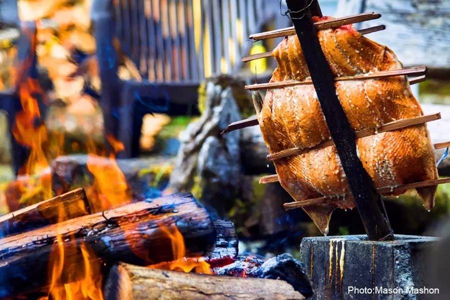 6月刚刚结束BC行程的《户外探险》杂志团队,就在温哥华岛的电报湾,体验了最原生态的美味。夸夸嘉夸族(Kwakwaka’wakw)的向导用专业娴熟的刀法将刚钓起的鲑鱼剖开,将鱼串到木棍上,劈柴、生火,再放到火上熏烤。不一会儿,充满柴木之香的原生态三文鱼就烤炙到位了!团队早已垂涎三尺,为这新鲜肥美香味醉人的三文鱼痴狂,很快就把它一扫而空……