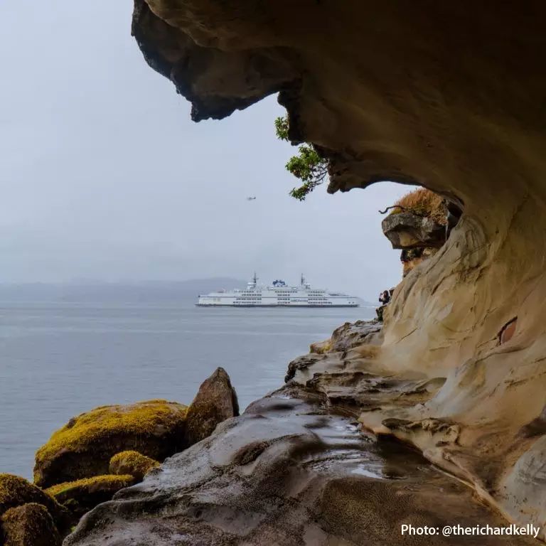 玛拉斯宾娜石廊(Malaspina Galleries)是小岛上一个非常知名的景点,它是由于海水长年累月侵蚀而形成的一个具有奇特纹路的长长的砂岩,就像是一个海上走廊,又像是一座 “海浪雕塑”,令人不得不赞叹大自然的鬼斧神工。