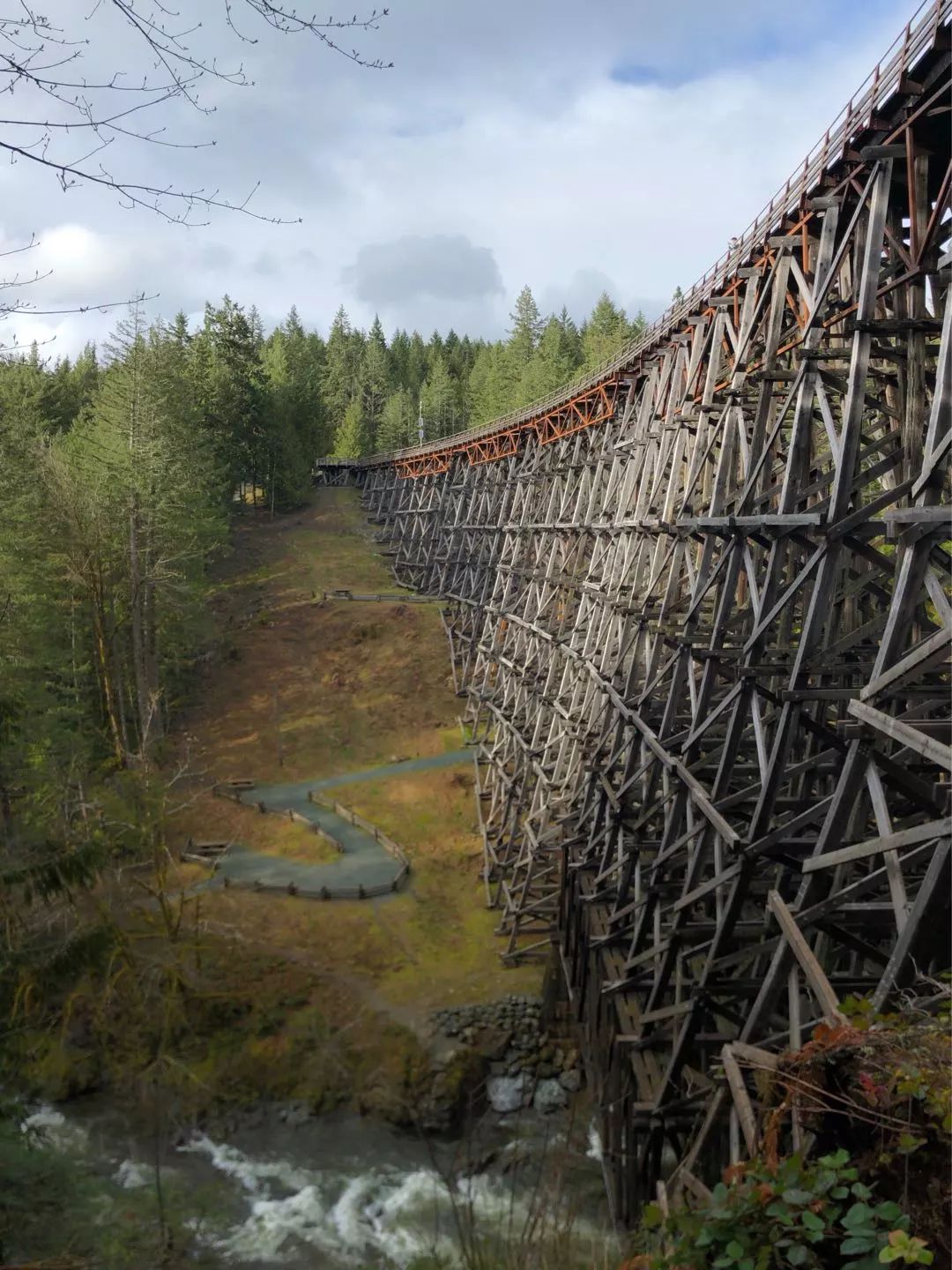 本来是用木头支撑起的铁路桥,堪称人间杰作。周围树木高达一百多米,垂直高度远比图片能展现的大得多。