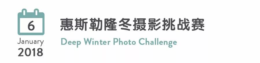 这是惠斯勒每年最值得期待的冬季活动之一。每年1月份,当地人们用“隆冬摄影挑战赛”(Deep Winter Photo Challenge)来庆祝暴风雪季的到来。每一个挑战“风暴国王(王后)”称号的参赛者必须在72小时之内完成照片拍摄,并提交5分钟的幻灯片介绍。