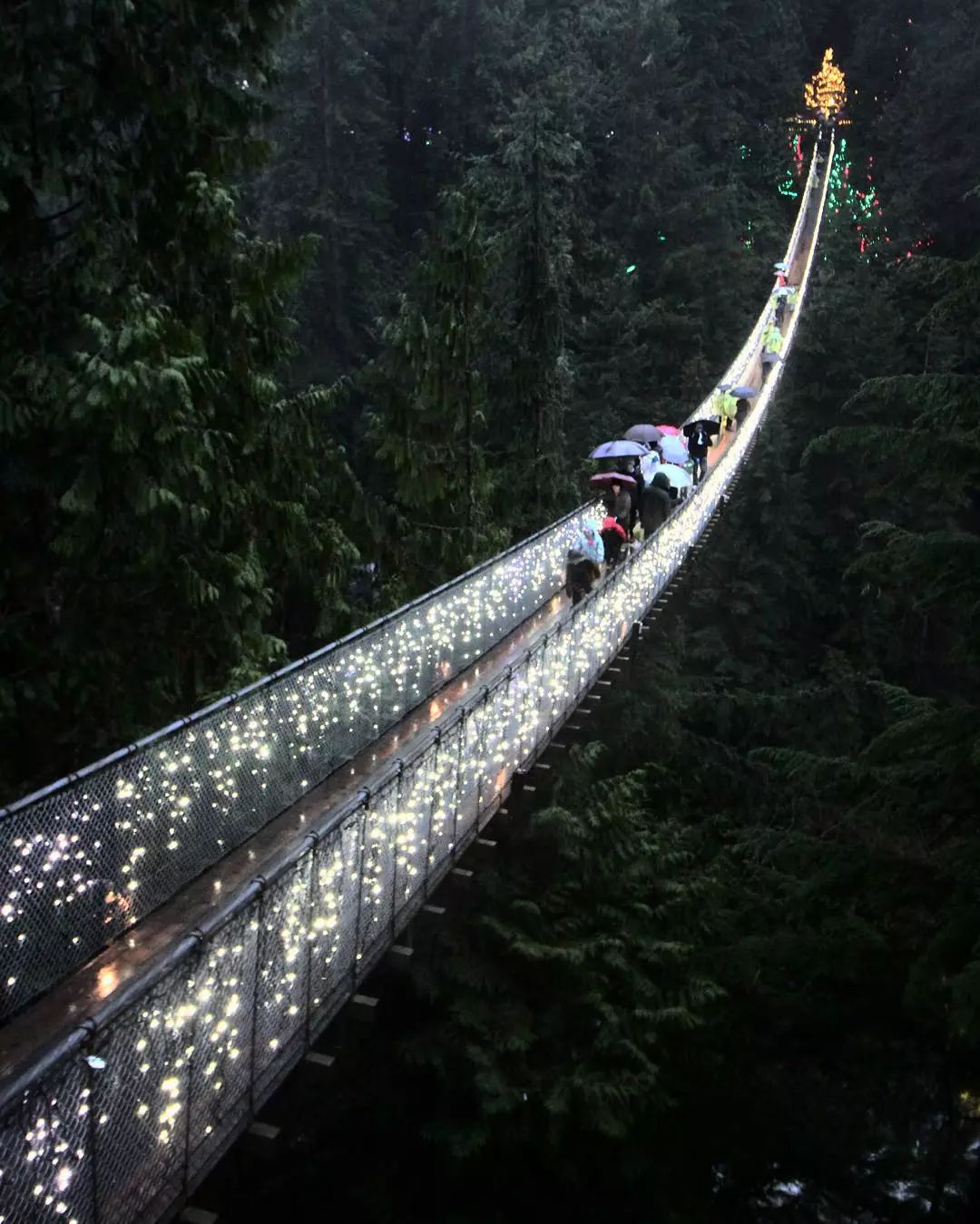 这个圣诞节,带上一盏圣诞灯,来一次峡谷灯光冒险怎么样?从11月23日到次年的1月28日,卡佩兰奴吊桥的桥身、树梢、悬崖步道、热带雨林和峡谷都被节日灯光所包围,在这里,视觉感官和肾上腺素同时被激发,绝对是一场不能错过的圣诞冒险之旅!