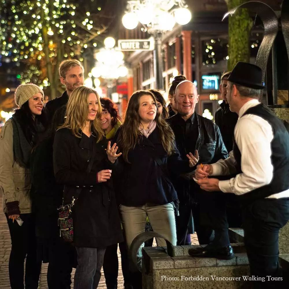 △ 威尔·伍兹在温哥华夜晚的街道向人们介绍温哥华曾经禁酒历史