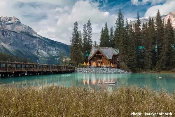 翡翠湖形成于1万多年前,与落基山脉的许多湖泊一样,是由于古⽼的冰川冰碛石形成堤坝,阻⽔而成的湖泊。湖并不深,但湖水在不同的光线下呈现深浅不同的绿色,因此这个湖被誉为“落基山的翡翠”。始建于1902年的翡翠湖客栈(Emerald Lake Lodge)正好就坐落在冰碛石上,一座小桥将质朴典雅的客栈与公路连接起来。站在停车场通往翡翠湖客栈的小桥上,湖面雪山倒影清丽可人,抬头则是高耸的雪山。