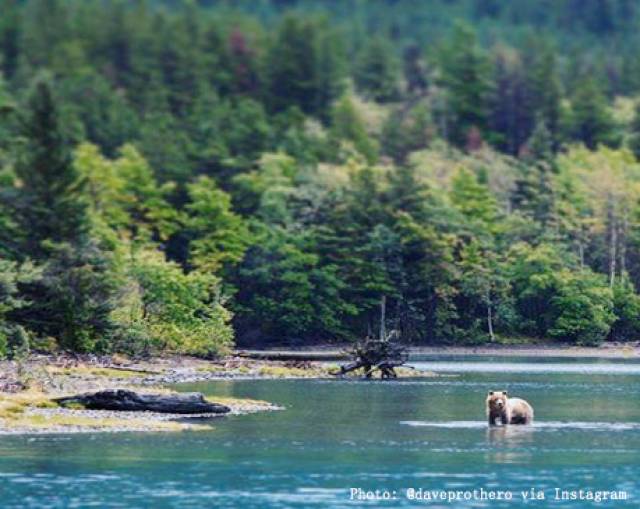 在临太平洋的这边,是巨大的温带雨林,树上覆盖着绿色的植被,棕熊在透明的湖水中寻找食物。