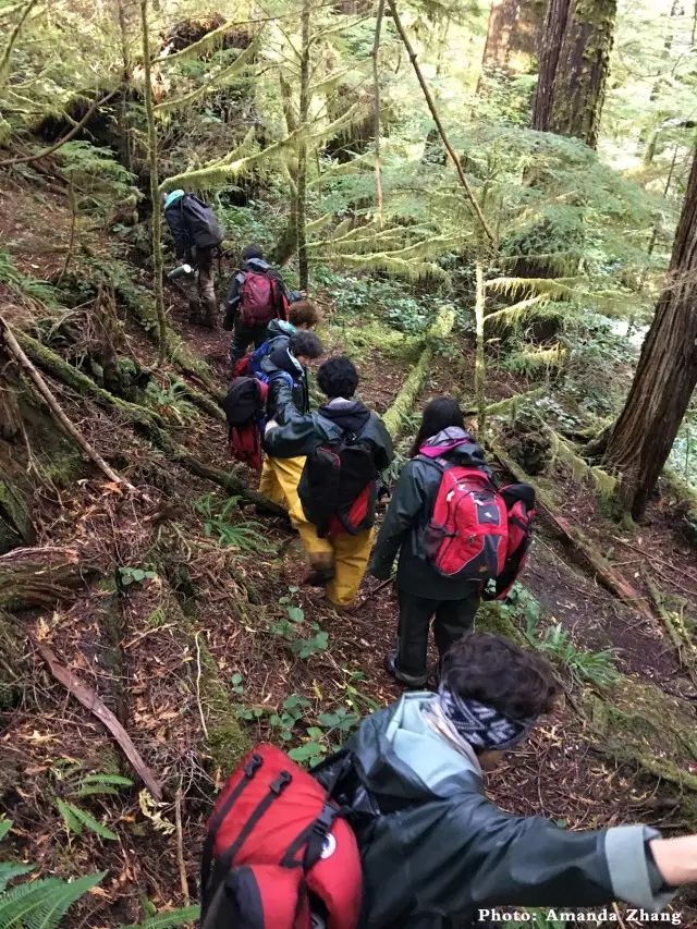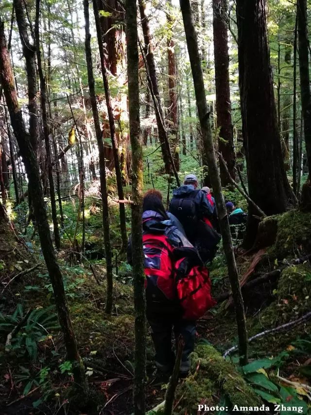 第二次参加野外探险旅行,但却是第一次在没有半点人工痕迹的加拿大BC省大熊雨林停留如此之久。深入原始森林,一路上悄无声息地趟着河、踩着没过脚脖子的稀泥、蹬着近2尺高稍不留神就滑倒的大石块,身上刮蹭着树枝叉,在密林中沿着熊的足迹到达Steep Creek观测点。