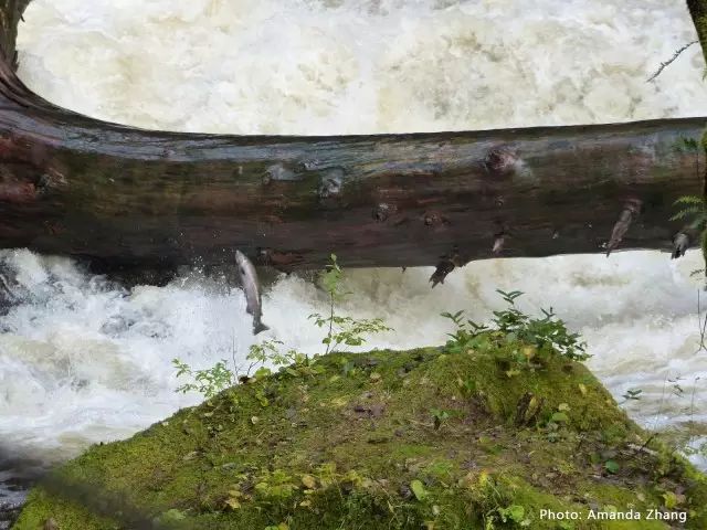 成群的三文鱼在湍流中奋勇逆游,不时有几只猛然发力跃出水面,又重重地拍在岩石或树干上。