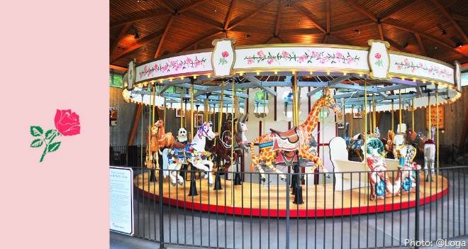 在花园里,有一座梦幻般的玫瑰旋转木马,旋转平台上有30个可爱的动物,长颈鹿、熊、鸵鸟、斑马等等,粉丝的玫瑰图案,装饰了多少颗粉色小公主的童心!