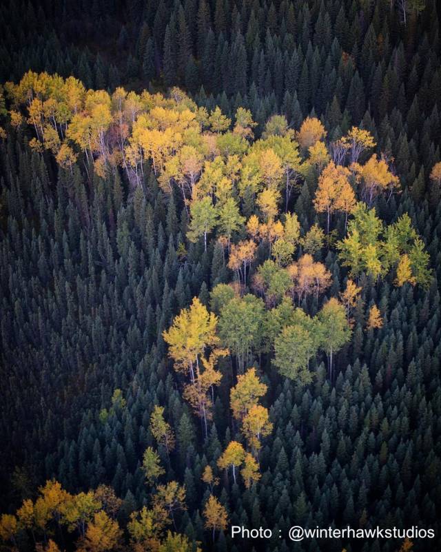 金黄的树林与湛蓝色的湖面,是大自然的天然调色盘。
