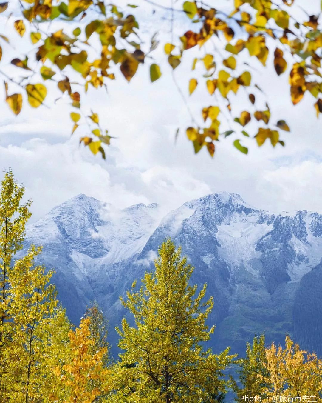 秋冬交接之时,秋意还未褪去,雪山已经露出了尖尖的头顶。