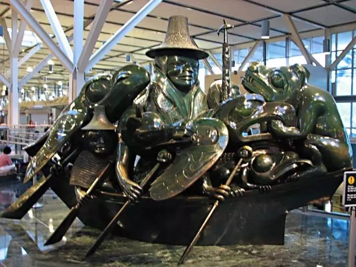 温哥华国际机场,安检口前摆着雕像“海达瓜依的精灵:碧玉独木舟”,这是加拿大艺术家比尔·瑞德(Bill Reid)的作品,熊、海狸、渡鸦、鹰、青蛙、逆戟鯨和巫师同坐一船。图/D.Gordon E. Robertson
