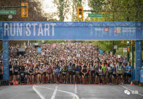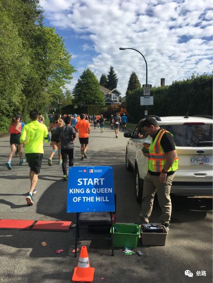主持人在起点拱门旁的舞台上为选手加油鼓气,同时也兼任鸣枪指挥。一个区域起跑后,间隔1分钟下一个区域再起跑。这也确保了并不宽阔的温哥华赛道一直比较顺畅,并没有拥堵。
