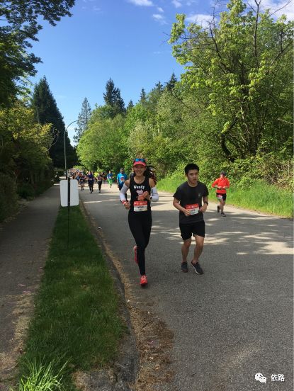16公里后的赛道开始进入UBC大学校园。作为全北美最美的校园,UBC的赛道上几乎看不到教学楼,教学楼被密不透风的参天大树层层围住,只能发现一栋栋砖红色的建筑散落在草坪上。