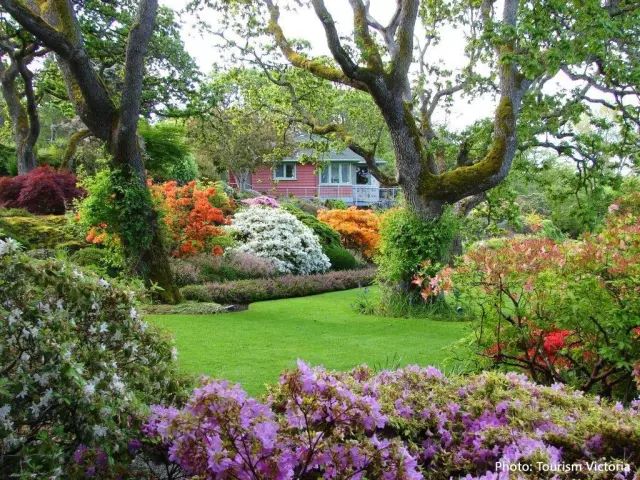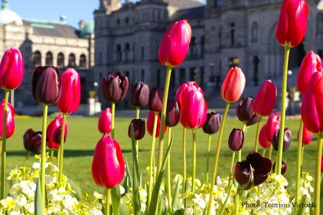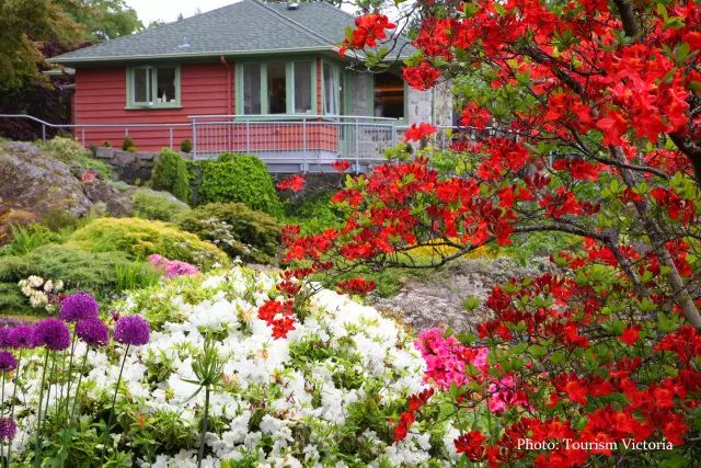 有着“花园之城”美誉的维多利亚,自然大街小巷也都是花的海洋。每年4月份,城市街道的灯柱上会被悬挂大约1,600盏花篮,共有超过25种植物品种,包括矮牵牛,天竺葵和地毯玫瑰。城市人行道边到处是盛开的玉兰,山茶花,樱花和梅花,而各个住宅区里也是一片令人心动的花满枝头。