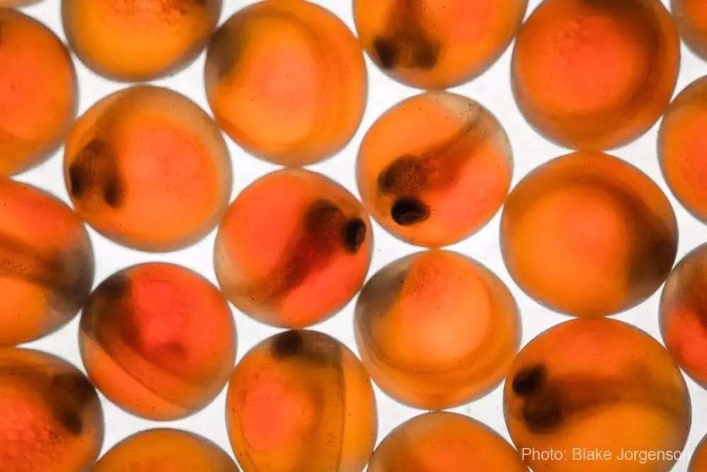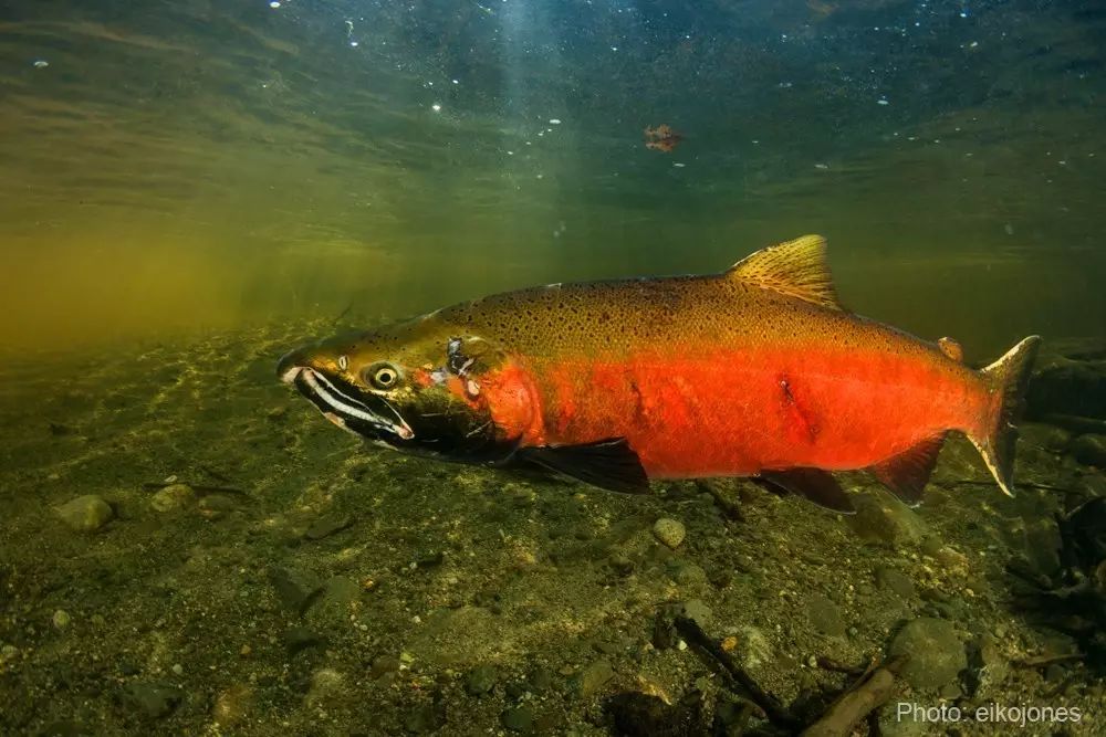 现在鲑鱼的身体逐渐起了变化,在性荷尔蒙的刺激下,鲑鱼长出了弓背和钩鼻,红鲑皮肤从银色变为鲜红色,它们的身体已经开始孕育卵子和精子。