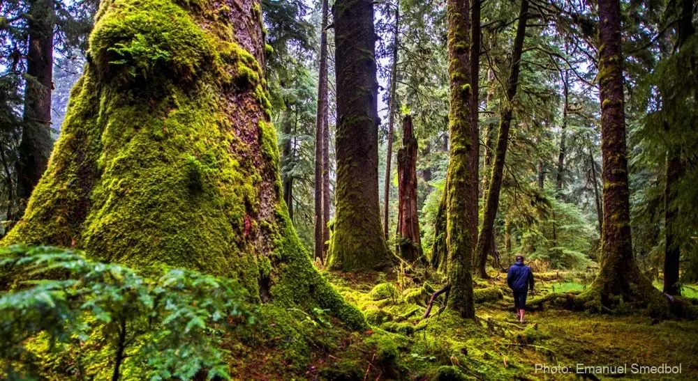 洄游产卵,沿途被各类动物掠食,最后的遗体散落在森林中,释放出来自海洋的氮碳、磷等养分,被加西云杉、红侩的树根吸收,成长为参天巨木。这不得不说是鲑鱼的功劳。