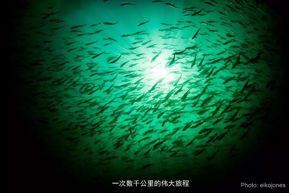 旅行的起点是广阔的太平洋,鲑鱼在洋流中寻找返乡的方向。