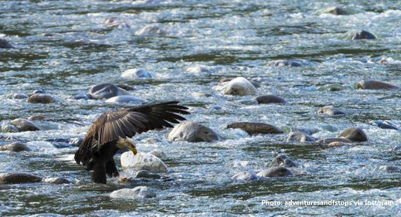 白头海雕伺机而动,准备抓捕鲑鱼。
