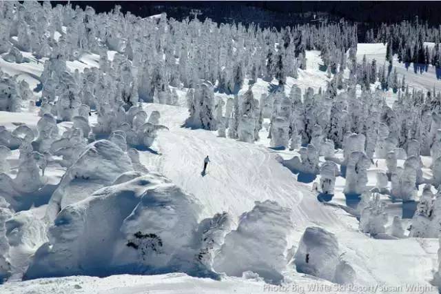 大白山滑雪度假村(Big White Ski Resort)的被雪和冰晶包裹起来的常青树宛若一个个调皮的白雪精灵姿态各异地和你玩着捉迷藏游戏,滑行期间,恍然置身于美丽的童话世界。