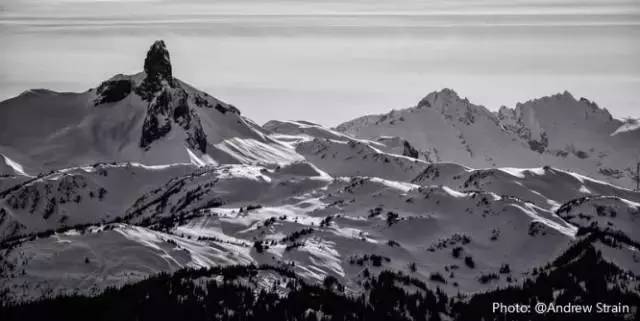 从惠斯勒黑梳山上可眺望到邻近加里波第省立公园(Garibaldi Provincial Park)的Black Tusk火山岩。黝黑的岩石千百年来矗立在北太平洋西岸的群山之巅,宛若侠之大者,遗世而独立,不离亦不弃。