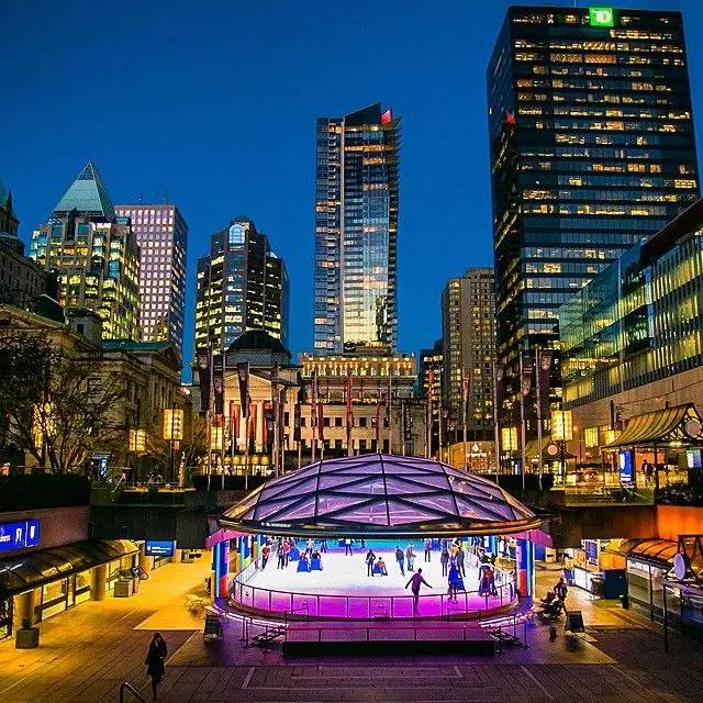 Robson Square是温哥华闹市中的一个广场,每年冬天都会变身为露天滑冰场免费向公众开放,在Robson Square滑冰是温哥华最暖心的冬季活动内容之一,深受本地市民和游客的喜爱。