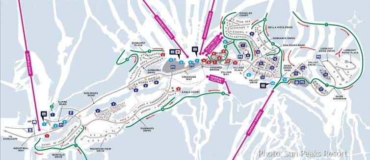 多家巴士服务运营商可将游客从汽车总站、机场和其他度假村载送至太阳峰度假村(Sun Peaks Resort)。温哥华机场、基洛纳机场、坎卢普斯机场、坎卢普斯(Kamloops)市的多个地点以及惠斯勒(Whistler)、雷夫尔斯托克高山度假村(Revelstoke Mountain Resort)、银星滑雪度假村(Silver Star Mountain Resort)和大白山滑雪度假村(Big White Ski Resort)均设有开往此地的巴士。在惠斯勒滑完海岸山脉的雪,跳上穿梭巴士前往太阳峰,接着冲浪BC内陆的香槟粉雪,是许多人的大爱。当地人把滑雪发烧友戏称为“Powder Hound”(粉雪猎狗),他们追赶着粉雪的飘洒,闻风而至,踏雪浪而去。