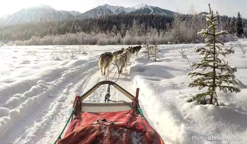 体验狗拉雪橇。每只雪橇犬都有自己的名字。8只雪橇犬拉两个人的雪橇,能达到60公里每小时的峰值速度。