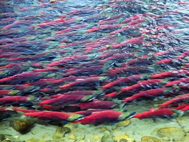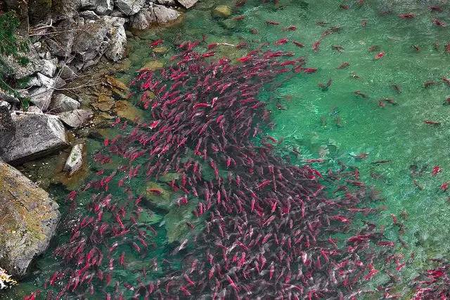每年8月至11月是观赏鲑鱼洄游的最佳季节,超过五亿条北美太平洋鲑鱼从波澜壮阔的大海逆流而上,回到出生的河流产卵, 尤为壮观的是,全身赤红的鲑鱼染红溪流湖泊!